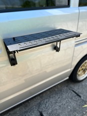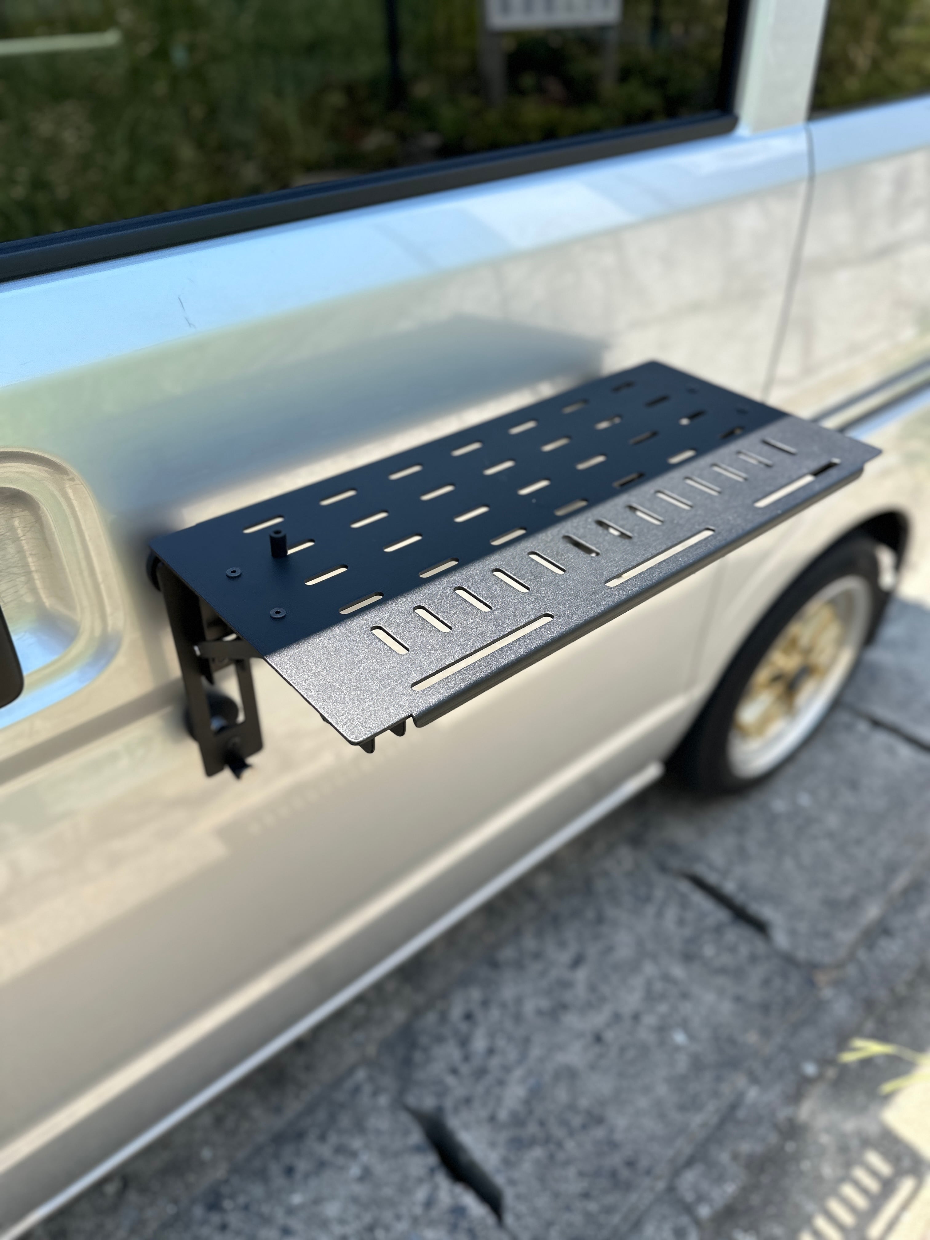 ガレージ、車、冷蔵庫など、お好きなところに取り付けて使用できるアルミ製テーブルです