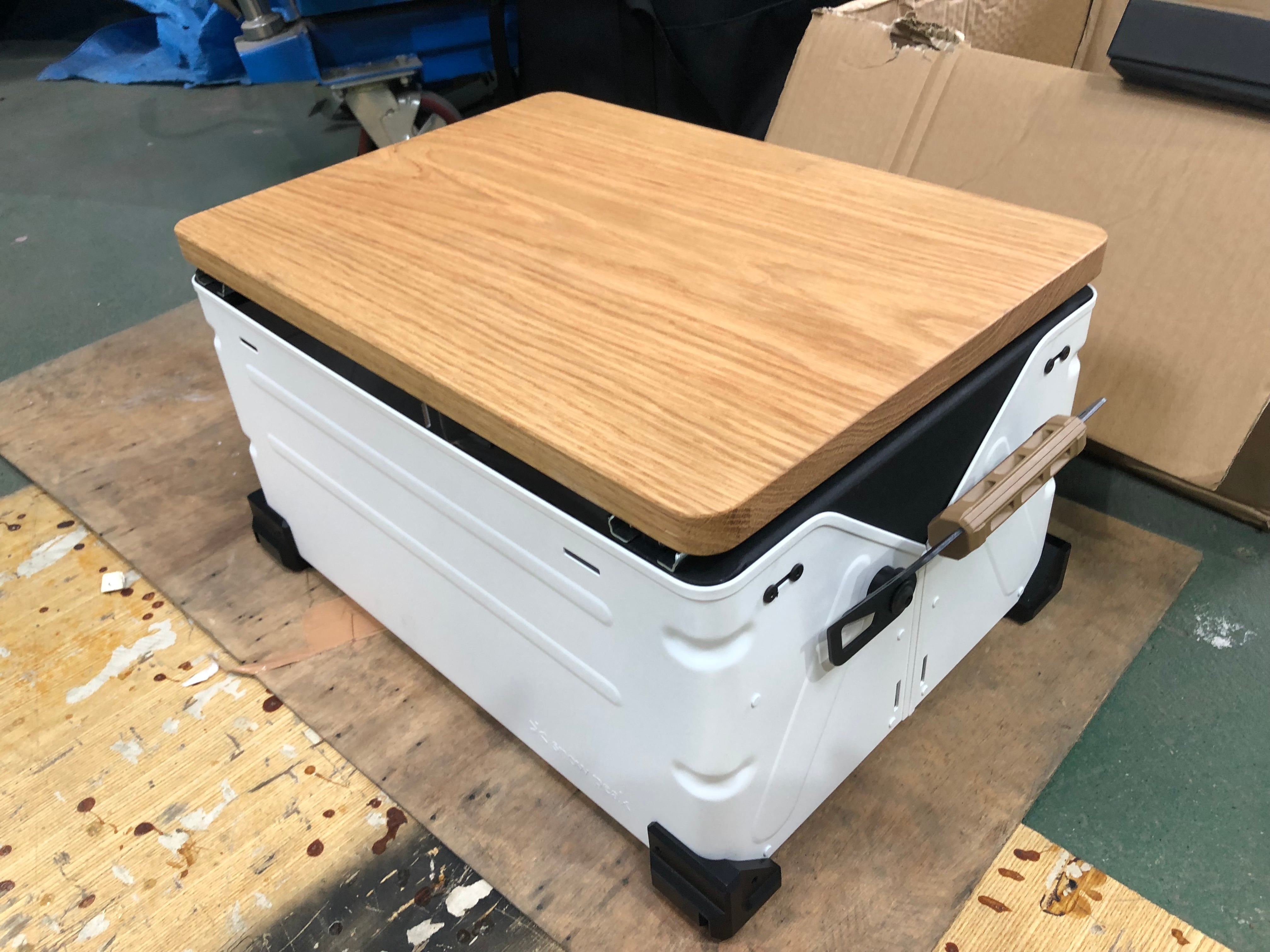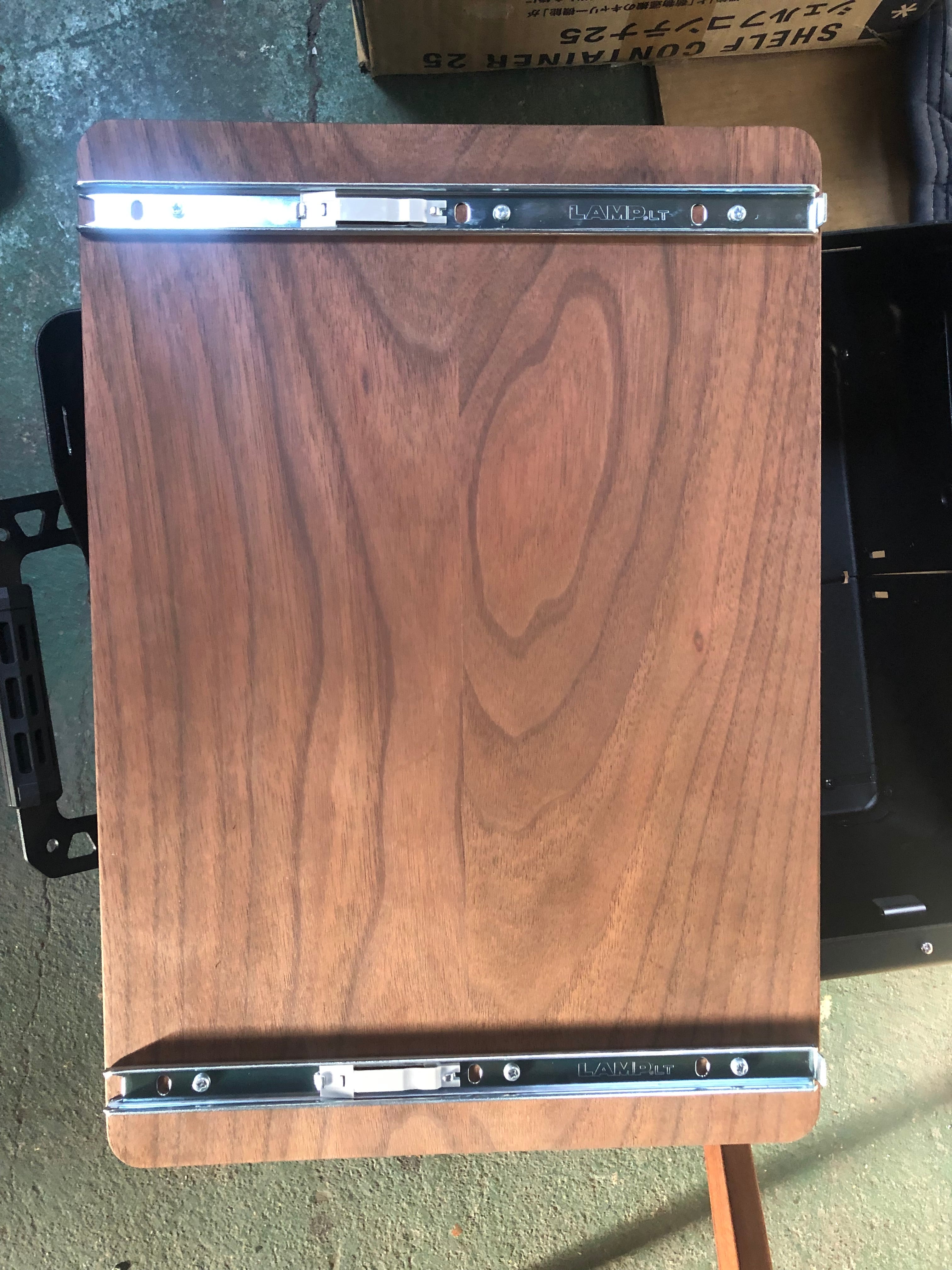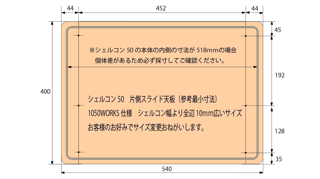 ※レールがシェルコン本体より両側に1cmずつほど飛び出すので天板のサイズがシェルコン本体より全体で2cmほど広く作製してください。